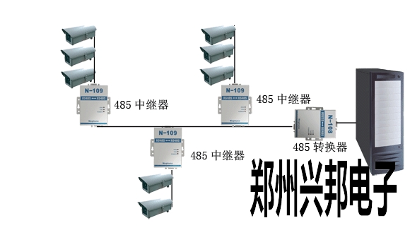 在某智能樓宇監控項目當中,每個樓層都有多個攝像頭對各個地點進行監控,利用485總線對攝像頭進行控制,施工單位在施工過程當中發現,如果按照原先的485總線型的拓撲結構的話,485總線主干線必須要經過每一個攝像頭,這樣將導致485線的距離非常的長,而且在后期的維護當中,由于所有的攝像頭都是經過一個485總線,如果在485總線上有一個攝像頭出現問題,有可能導致整個系統不能運行。他們使用485中繼器將原先的485總線型的拓撲結構改造成樹型的拓撲結構,大大簡化了施工,并且極其方便后期的維護。極大的節省了費用。