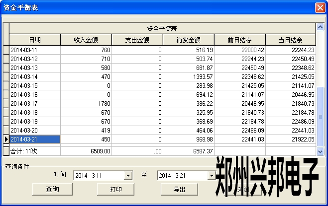 485軟件中資金平衡表是查詢指定日期的賬目情況,包括收入、支出、消費和結(jié)余,統(tǒng)計時是按天統(tǒng)計的,顯示時也是按天顯示,一天一行,每一天都一個結(jié)存,當(dāng)日結(jié)余=收入金額-支出金額-消費金額+前日結(jié)存,收入是指出納員每天的存款、收取的卡本金等,支出是指取款、退還卡本金、收繳舊卡的退款等,消費金額是指每天的消費總額,前日結(jié)存是指前一天的結(jié)余,每天的賬都是互相關(guān)聯(lián)的,若有一天的賬目不對,會影響到以后的所有賬目,所以在結(jié)賬前要求必須將所有消費數(shù)據(jù)都采集完畢。