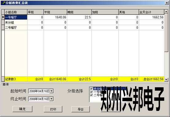 根據時間查詢出每組機器在每個時間段和所有時間段的消費匯總情況,此表一般在給餐廳結帳時使用。