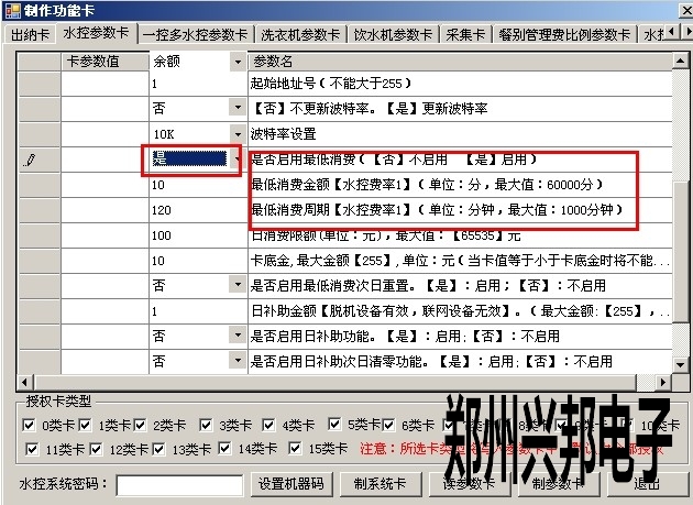 2)打開軟件 制卡中心-功能卡制作-水控參數卡中的最低消費周期,先選擇啟用,然后輸入最低消費金額和最低消費周期,最低消費金額以分為單位,最低消費周期以分鐘為單位,設置好后點擊制參數卡即可;
