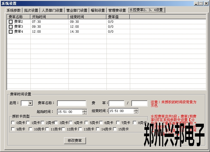 2、設(shè)置幾點(diǎn)到幾點(diǎn)之音流多長時間扣多少錢,在管理中心-系統(tǒng)設(shè)置-水控費(fèi)率2、3、4設(shè)置里面設(shè)置時間,費(fèi)率。