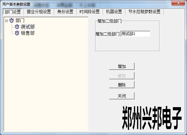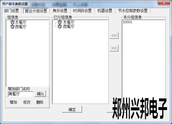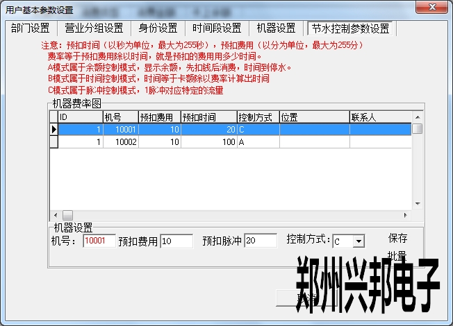 在使用興邦一卡通平臺用戶基本參數設置中有部門設置、營業分組設置、身份設置、時間段設置、機器設置、節水控制參數設置。下面依次為其說明。