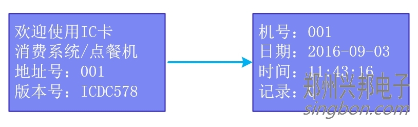 將消費(fèi)機(jī)插上12V電源,開機(jī)時(shí)顯示版本號(hào)和機(jī)器號(hào),最后轉(zhuǎn)入待機(jī)界面,顯示機(jī)器號(hào)、日期、時(shí)間界面。