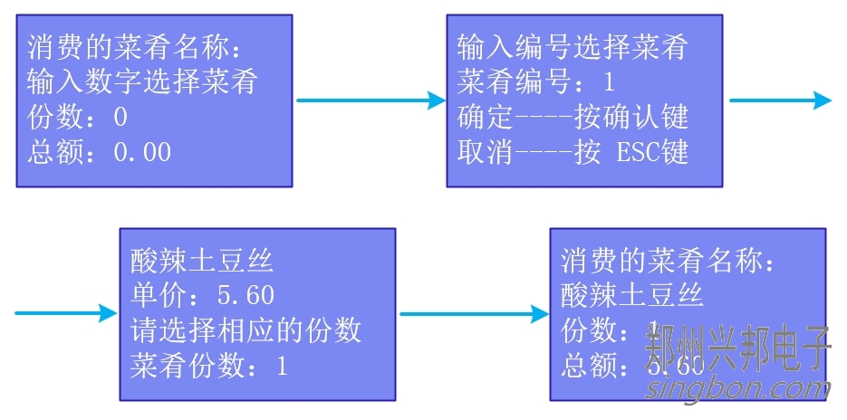 ① 自動(dòng)模式:輸入菜肴編號(hào),點(diǎn)擊確認(rèn)后選擇份數(shù),點(diǎn)擊確任后出現(xiàn)消費(fèi)的菜肴名稱、份數(shù)、總額,將卡片放于刷卡區(qū),即可進(jìn)行扣費(fèi),扣費(fèi)后顯示扣費(fèi)金額、手續(xù)費(fèi)用、卡上余額、卡號(hào),操作流程如下圖所示: