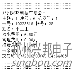 ② 計(jì)算模式:輸入扣費(fèi)金額,按[確認(rèn)]鍵后,將卡片放于刷卡區(qū),即可進(jìn)行扣費(fèi),若連接的有打印機(jī),可直接打印消費(fèi)明細(xì),打印出的信息如下圖所示: