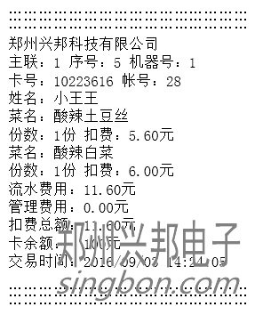 3) 自動(dòng)消費(fèi)模式:最多可設(shè)置8個(gè)費(fèi)率,每個(gè)費(fèi)率可設(shè)置對(duì)應(yīng)的菜肴、份數(shù),將費(fèi)率設(shè)置好之后在自動(dòng)模式下輸入相應(yīng)的費(fèi)率編號(hào)放卡即可自動(dòng)扣除相應(yīng)費(fèi)用。只有計(jì)算和自動(dòng)模式可以用,計(jì)算模式只作為查看使用,不能扣費(fèi)。若連接的有打印機(jī),可打印消費(fèi)明細(xì),打印出來的消費(fèi)明細(xì)格式如下圖所示: