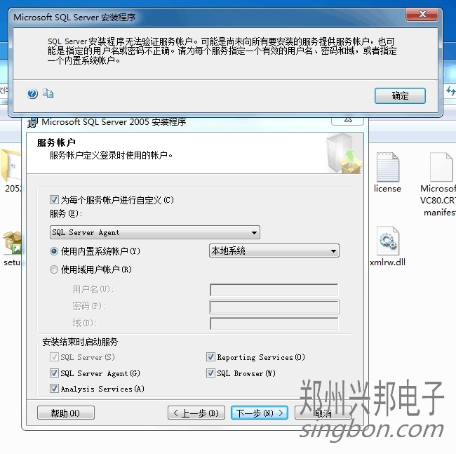 客戶使用的我們的局域網一卡通食堂售飯機,在安裝SQL Server2005時提示安裝程序無法驗證服務帳戶。這是怎么回事呢?