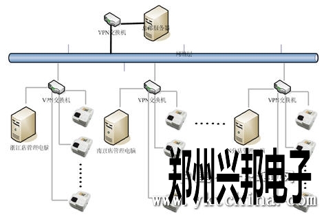 如上圖所示,把整個系統(tǒng)的管理電腦納入到VPN局域網絡中來,使各家分店和總部服務器之間的通訊無地理的局限,實現整個系統(tǒng)數據的實時交換。